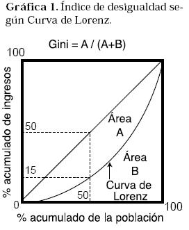 El Coeficiente de Gini es el cociente del área comprendida entre la diagonal de 45° y la Curva de Lorenz (área A), sobre el área constituida por el triángulo debajo de la línea de 45° graficada como (A + B). En la práctica se calcula con diversas fórmulas y metodologías que arrojan resultados no siempre equivalentes. Valores de hasta 0,30 (que se ven en Polonia y Suecia) reflejan una distribución del ingreso equitativa. Se puede hablar de situaciones de desigualdad a partir de 0,40 y hasta 0,60, intervalo donde se encuentran en su mayoría los países latinoamericanos. Por encima de 0,60 el índice expresa una distribución gravemente inequitativa.