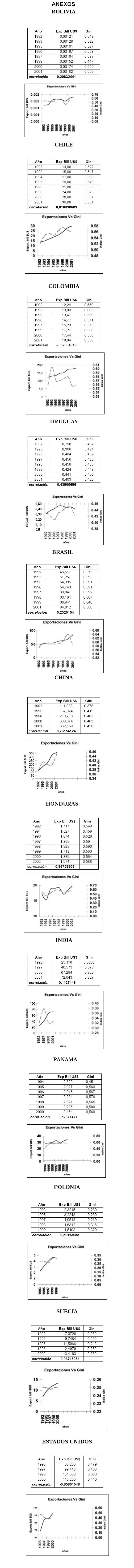 Por último, en cuanto al estudio realizado es indispensable hacer alusión a las correlaciones, teniendo en cuenta que cuando esta es positiva y alta lo que significa en teoría, es que con un aumento de las exportaciones se dé un aumento del índice Gini, como sucede en países como Argentina, Bolivia, Uruguay, China, Chile, Costa Rica y Honduras, lo que nos llevaría a concluir nuevamente a favor de lo visto bibliográficamente. Mientras que si la correlación es negativa lo que traduce es que al aumentar las exportaciones, el índice Gini disminuye, como sucede en países tales como Colombia y Estados Unidos, que posiblemente por su estructura social y económica demuestran lo contrario. Igualmente estos cambios se pueden observar con más claridad en los gráficos presentados en la hoja de Anexos, donde se muestra la curva de exportaciones versus la curva del coeficiente Gini durante los años comprendidos para cada país de la muestra de estudio.