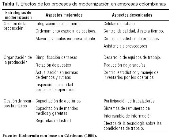 La apertura económica obligó a las empresas a desarrollar estrategias de modernización centradas en tres frentes: gestión de la producción, organización de la producción y gestión de recursos humanos (Cárdenas, 1999). En la Tabla 1 se muestran los aspectos mejorados y los aspectos descuidados en estos frentes.