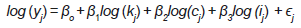 donde j = 1,2,...N son observaciones y ϵ es un término de error aleatorio. Dadas las propiedades de la ecuación 1 los parámetros β pueden interpretarse como elasticidades, esto es, miden el cambio porcentual esperado en la producción como resultado de un aumento de un 1% de una variable explicativa (CBO, 2005). En este sentido, el parámetro de interés es β 3, que mide el impacto de las inversiones en innovación sobre la productividad empresarial. En el informe de CBO (2005) se reporta que la estimación de β 3 suele estar en el rango entre 0,10 y 0,20, lo que significa que un aumento de 10% del insumo innovación podría causar un incremento de la producción del orden del 1% o 2%. Por su parte, en el estudio de Brynjolfsson y Hitt (2003) reportan elasticidades calculadas en una muestra de grandes empresas en Estados Unidos en el período de 1987-1994. En el corto plazo (t=1) reportan un valor de 0,019 para el insumo computadoras y de 0,119 para los bienes de capital; estos parámetros aumentan monotónicamente hasta alcanzar valores de 0,078 y 0,202, respectivamente, en el período t+7, cuando concluye el estudio. Este conjunto de valores son de utilidad para comparar las estimaciones que se realizarán.