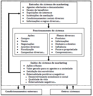 Nas entradas do sistema de marketing tem-se, de um lado, os ofertantes e, de outro, os demandantes, cada um com suas necessidades e desejos, sendo intermediados por diversas instituições e condicionamentos sociais. No processamento do sistema, observamos as ações de compra, venda, negociações etc., e o fluxo de produtos, informações, dinheiro, influência, compromisso etc., desembocando nas saídas do sistema que geram ações, fluxos, valor, satisfação e externalidades, tudo isso levando em conta a influência de condicionamentos externos e de outros sistemas ou subsistemas.