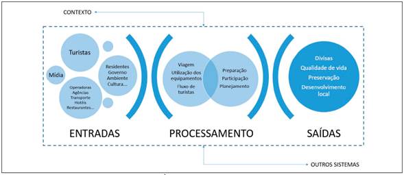 Na perspectiva desse ensaio, em que se propõe pensar em atividades turísticas a partir da perspectiva de sistema de marketing, argumenta-se que esta representa uma forma mais completa e macro de compreender a atividade, a partir da composição das entradas e saídas desse sistema, incluindo suas externalidades. No caso do turismo, uma lente de sistemas pode auxiliar em uma melhor análise e identificação dos agentes envolvidos, além do entendimento das necessidades de cada um e da possível visualização de situações de desequilíbrio desse sistema. As saídas esperadas desse sistema devem estar voltadas para o desenvolvimento social e econômico do lugar, bem como para a geração de qualidade de vida para os residentes (Medeiros, 2013).