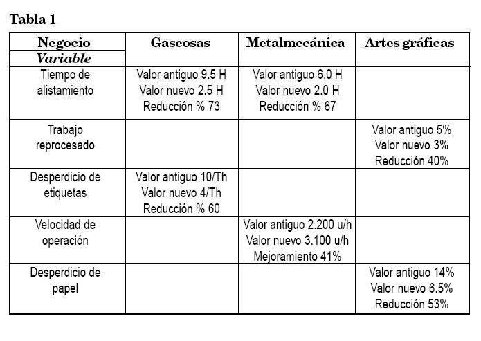El otro conjunto de resultados es más cuantitativo y también aparece documentado. Estos se refieren a cambios dramáticos obtenidos en los tiempos de alistamiento, desperdicio de materiales y pedidos reprocesados y se presentan en la Tabla 1.