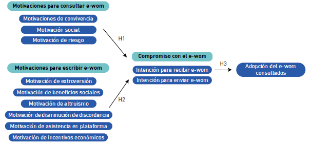 Según las bases teóricas, una experiencia positiva del consumidor contribuye psicológicamente con el deseo de querer compartirla con otros, y esto es posible mediante la escritura de una reseña positiva en el e-WOM (Viglia, Furlan y Ladrón-de-Guevara, 2014). El compromiso con el e-WOM que se genera después de una compra está vinculado a una serie de necesidades intrínsecas, como la participación en una comunidad virtual, los incentivos y beneficios esperados (por ejemplo, reputación), el sentido de pertenencia y el deseo de ayudar (Yang, 2017). A raíz de estos trabajos, se supone una relación entre las motivaciones para compartir comentarios y el compromiso con el e-WOM, por lo que se plantea la segunda hipótesis:
