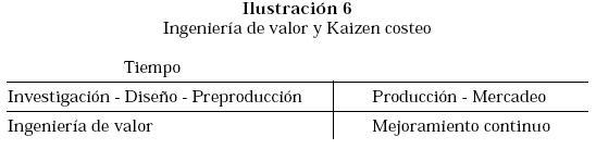 Mejoramiento Continuo y Costeo Kaizen: El mejoramiento continuo pretende lograr sucesivas reducciones de costos en los productos y servicios que la organización proporciona a los clientes. Desarrollado en el Japón y denominado «Kaizen» comienza donde termina la ingeniería de valor. Mientras la ingeniería de valor es un enfoque proactivo durante la investigación, diseño y producción del ciclo de vida del producto, el mejoramiento continuo actúa proactivamente durante la producción y mercadeo del producto.