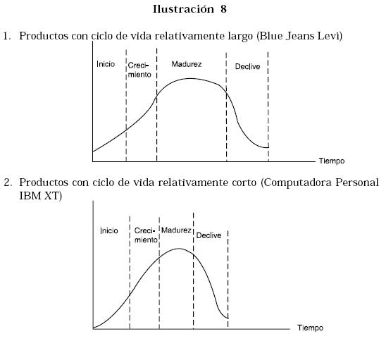 En la ilustración No. 8 los ingresos por venta sobre el ciclo de vida están representados en el eje vertical y el tiempo en el eje horizontal. La parte (1) de la ilustración muestra un producto con un ciclo de vida relativamente largo, tal como el Ford Modelo T, Coca-cola, los blue jeans «Levi»; algunos, como el Modelo T, han completado su ciclo, otros como la Cocacola permanecen indefinidamente en su etapa de madurez.