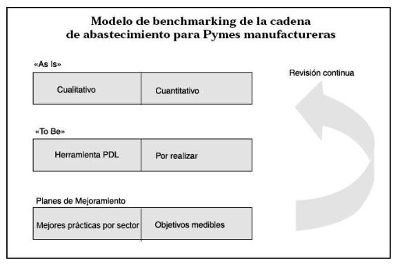 Un modelo de bechmarking es la representación de la manera como una Pyme puede iniciar un proceso de mejoramiento de los procesos de la cadena de abastecimiento, los cuales se definen en el sistema logístico integral como una adaptación para Pymes de los procesos presentados para cadenas de abastecimiento en empresas de mayor envergadura y complejidad. El concepto de sistema logístico integral para Pymes equivale al concepto de cadena de abastecimiento presentado anteriormente.