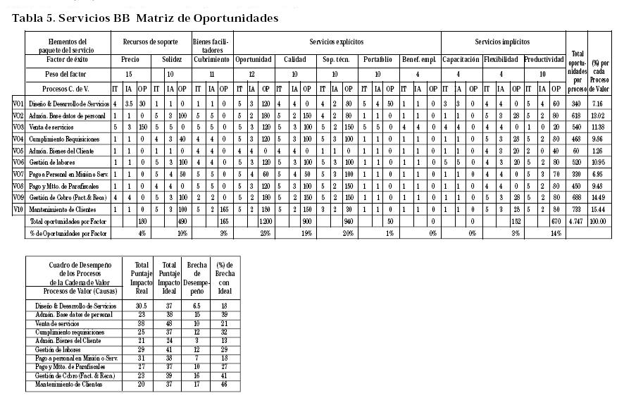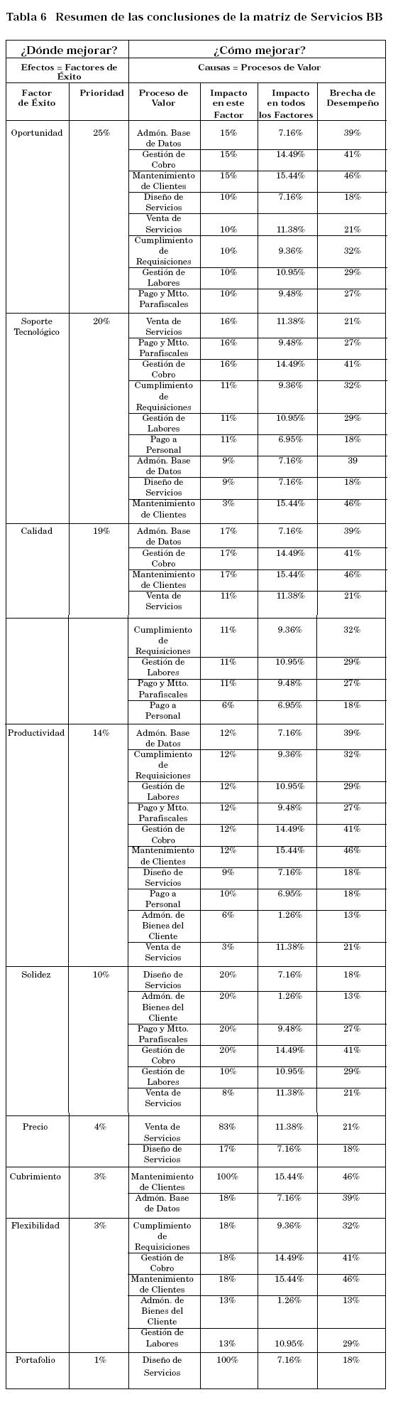 Es conveniente hacer algunos comentarios sobre esta matriz y que se pueden resumir explicando primero que horizontalmente se han agrupado los Factores de Éxito y sus Pesos dentro del concepto de Paquete del Servicio para generar un panorama claro.